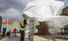 Rzeźbiarze Łukasz Surowiec i Monika Szpener zasłonili pomnik Gryfa przed szczecińskim magistratem. Ta artystyczna inicjatywa ma przypominać szczecinianom o bestialskiej agresji Rosji na Ukrainę. - Wojna trwa od roku 2014 - przypomniał Łukasz Surowiec...