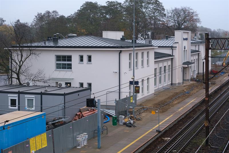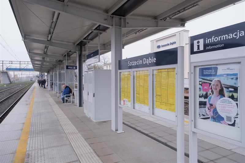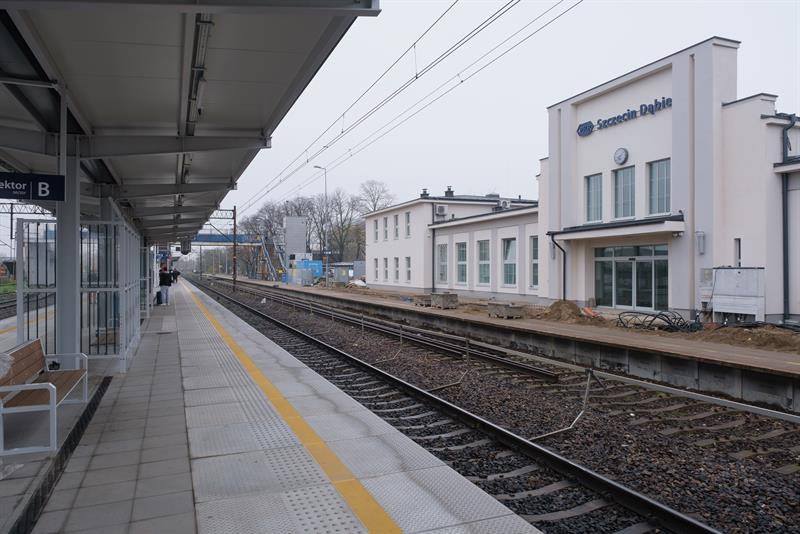 Na dworcu kolejowym w Szczecinie Dąbiu widać efekty remontu. Od strony peronów odsłonięto elewację. Widać świeżą fasadę i nowy dach, wewnątrz trwają jeszcze prace wykończeniowe. Dworzec, który przez lata był zaniedbany, stopniowo odzyskuje dawny wygląd.