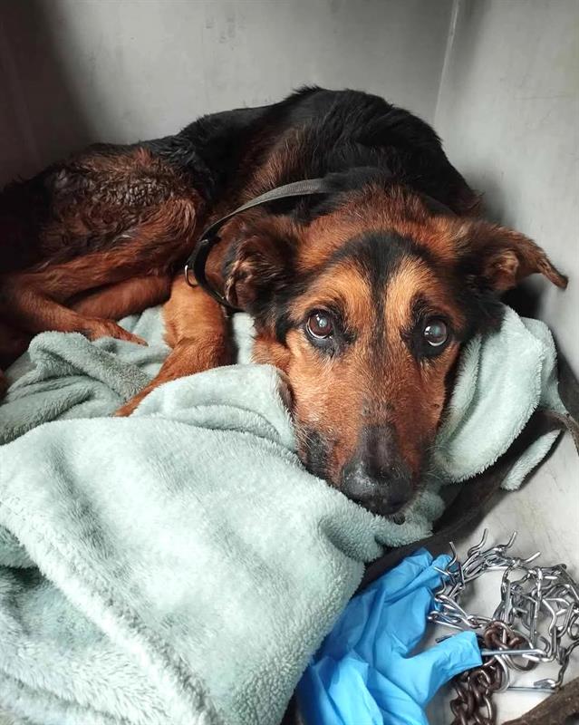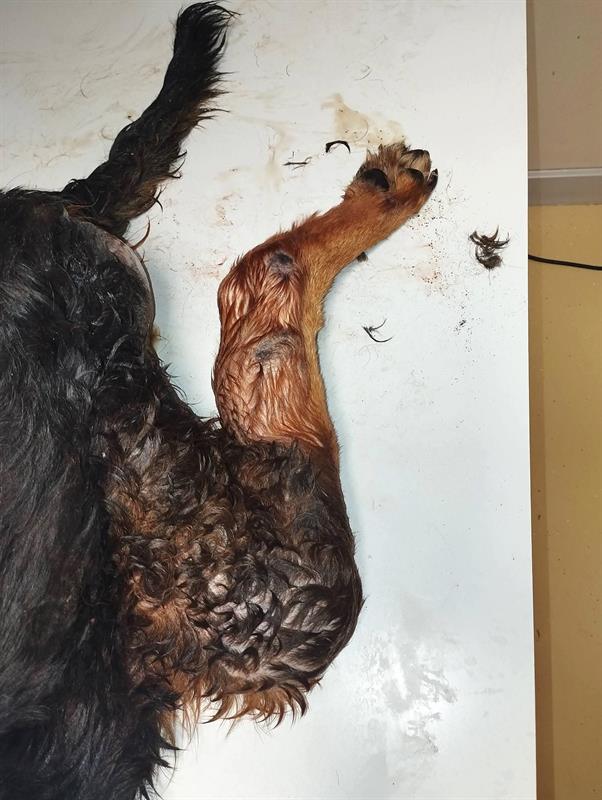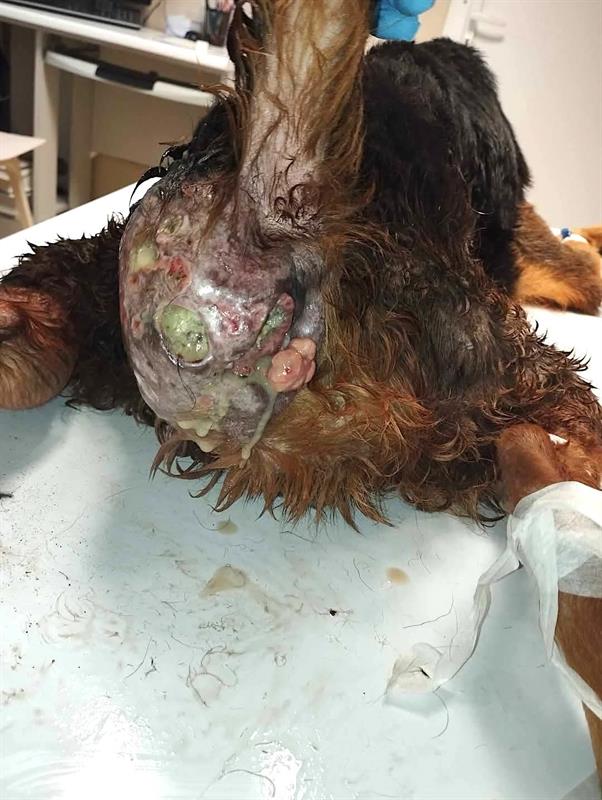 Pies gnił za życia, a jego ciało pokrywały otwarte rany i guzy sączące się ropą. W tym ogromny, przy odbycie. Przegniły mu zęby, nawet dziąsła. Miał potwornie opuchniętą bezwładną łapę. Pchły. Nie był w stanie się podnieść, więc leżał we własnych odchodach, mokry od moczu. Dogorywał od dłuższego czasu - bez pomocy - o czym świadczyły liczne odparzenia i odleżyny na jego ciele.