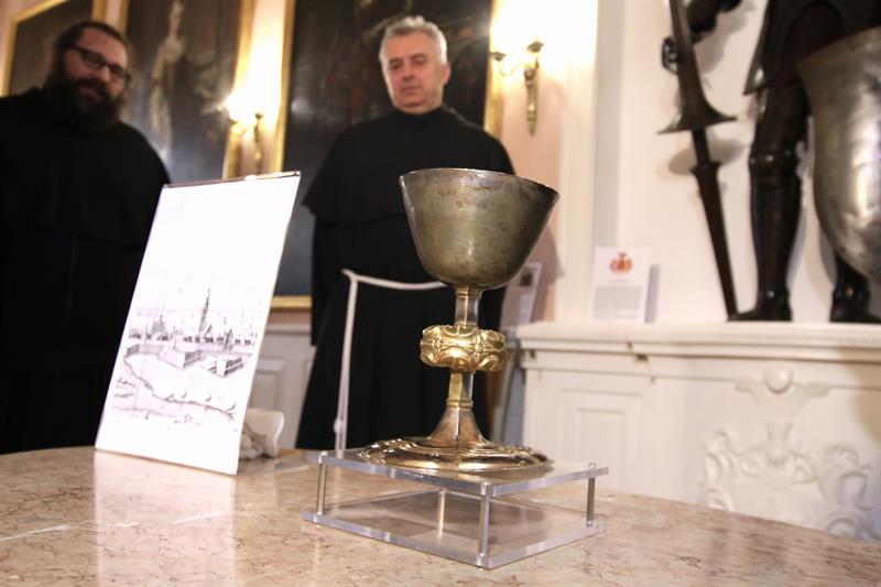 Na ślad kielicha natrafił ojciec Łukasz Waszkielis - franciszkanin, a zarazem historyk sztuki odpowiedzialny za zabytki z Prowincji Św. Maksymiliana Marii Kolbego. Poszukując informacji na temat zabytków z terenu Pomorza Zachodniego natrafił on na artykuł kierownika Działu Historii Kołobrzegu Muzeum Oręża Polskiego dr Roberta Dziemby, który opisał
