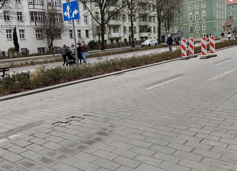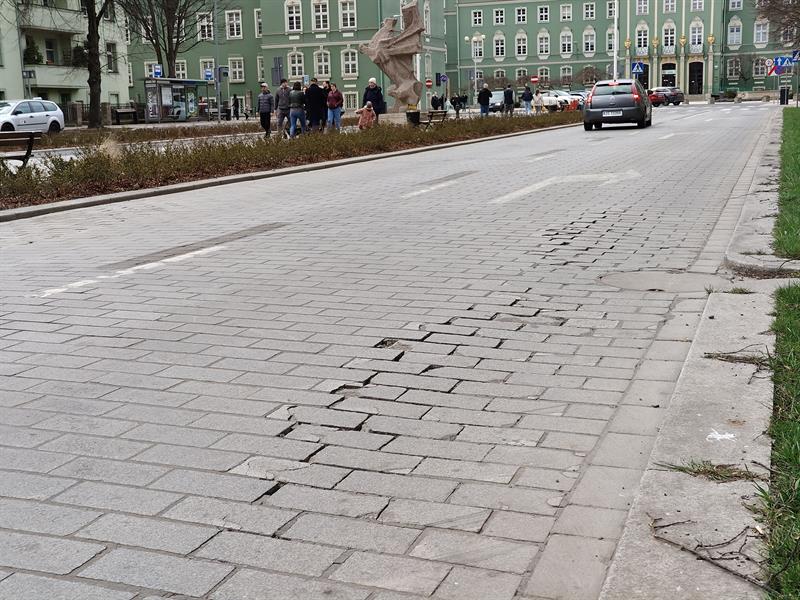 Asfaltowa nakładka jezdni w al. Papieża Jana Pawła II - na odcinku od pl. Grunwaldzkiego po ul. Felczaka i pl. Armii Krajowej - została zastąpiona kamienną kostką. Już po kilku miesiącach od zakończenia inwestycji (udostępniona dla ruchu 1 kwietnia 2022 r.) nowa nawierzchnia miejscami zaczęła się zapadać, bruk „płynąć", a spoinująca je fuga wykruszać. Wykonawca - w ramach gwarancji i na własny koszt - dokonywał kolejnych poprawek. Gdy cząstkowe zakończył w jednym miejscu, usterki pojawiały się w kolejnym.