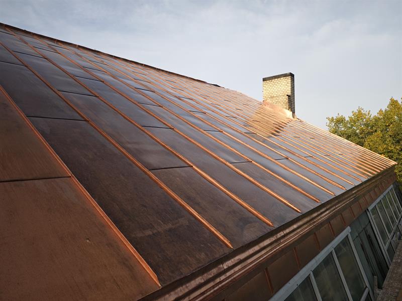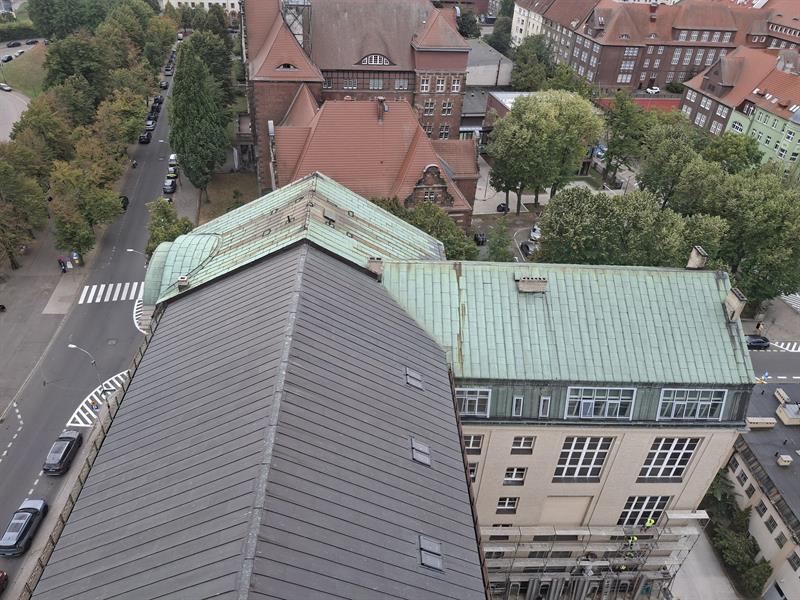 W ramach prac na dachu i poddaszu południowego skrzydła budynku zrealizowano wymianę miedzianego pokrycia połaci i koryt dachowych, montaż okien połaciowych, montaż płotków śniegowych i murowanie kominów.
