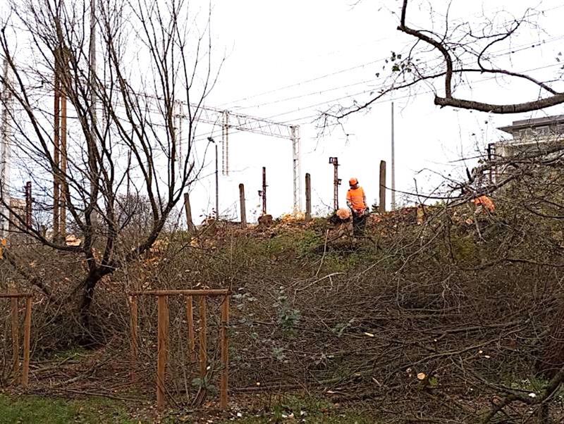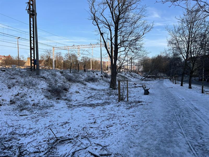 Ze skarp przy torach wzdłuż ul. Orzeszkowej w Szczecinie wyrżnięto całą zieleń wysoką. Przetrwały tylko drzewa rosnące najbliżej pasa jezdni. Czy uda się odtworzyć park linearny, jaki w tym miejscu osłaniał mieszkalne budynki od kolejowego torowiska? Czy specjalne ekrany ochronią mieszkańców przed hałasem oraz zagrożeniem, jakim są m.in. ładunki niebezpiecznej chemii przewożone wagonami opodal ich domów?