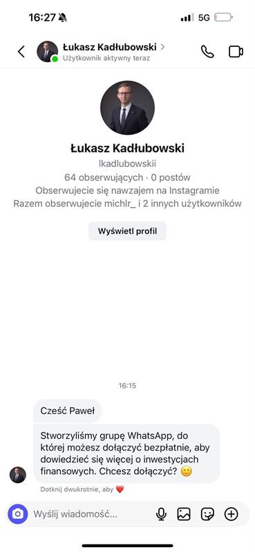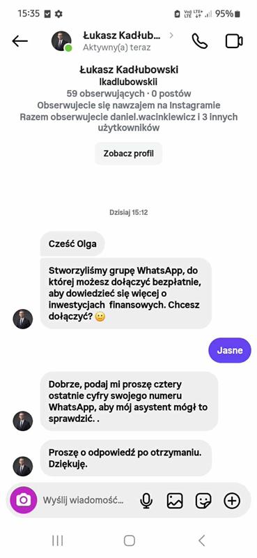 We wtorek (25 listopada) znajomi wiceprezydenta Łukasza Kadłubowskiego odebrali wiadomość: „Cześć. Stworzyliśmy grupę WhatsApp, do której możesz dołączyć bezpłatnie, aby dowiedzieć się więcej o inwestycjach finansowych. Chcesz dołączyć?" Gdy znajomy potwierdzał, otrzymywał kolejny komunikat: „Dobrze, podaj mi proszę cztery ostatnie cyfry swojego numeru WhatsApp, aby mój asystent mógł to sprawdzić. Proszę o odpowiedź po otrzymaniu. Dziękuję".
