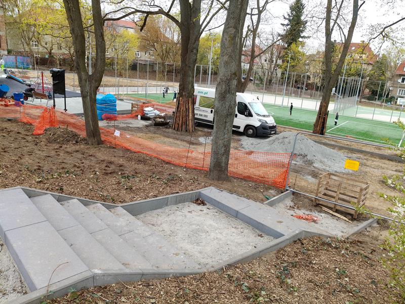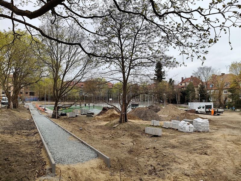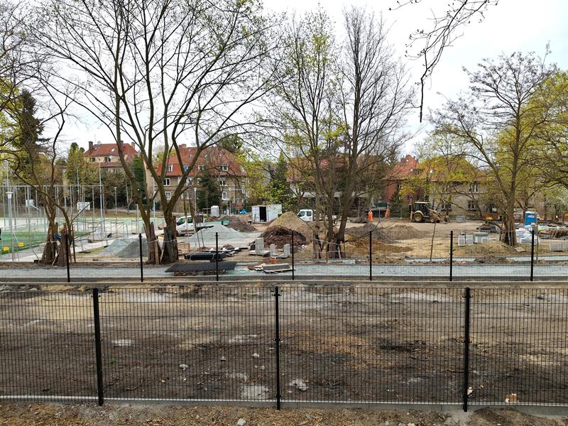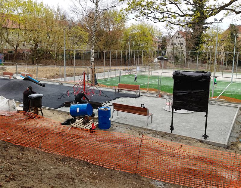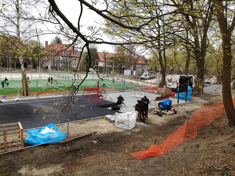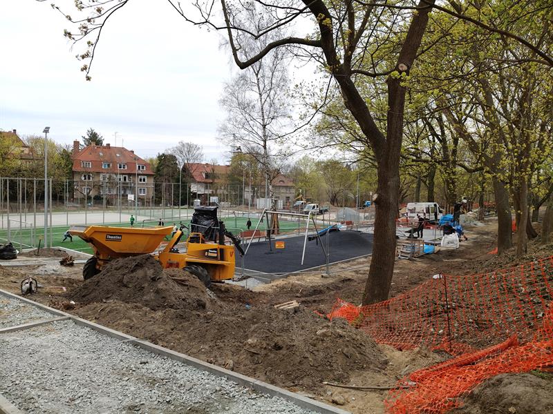 Na placu zabaw już zamontowano huśtawki, karuzelę, zjeżdżalnię, a pod wspinaczkową „pajęczą siecią" właśnie jest formowana bezpieczna nawierzchnia. Wzdłuż wytyczonego traktu spacerowego stanęły pierwsze ławki. Zamontowano podstawowe przęsła ogrodzenia przyszłego wybiegu dla psów.