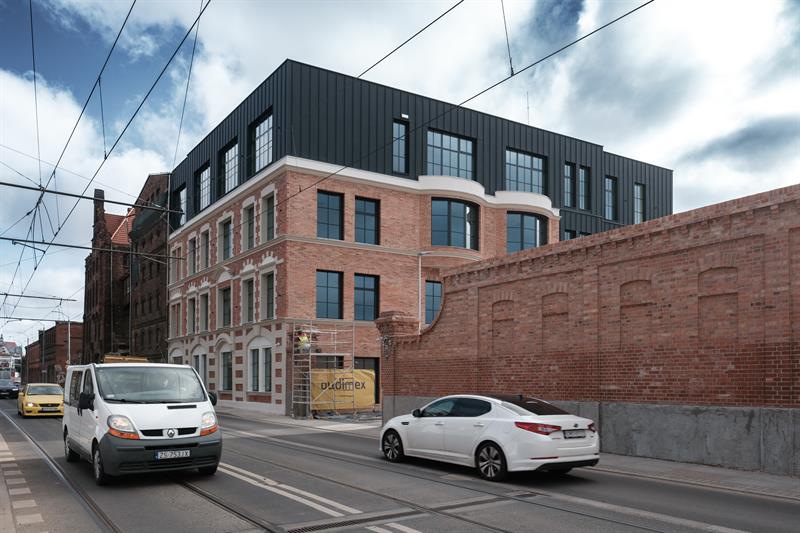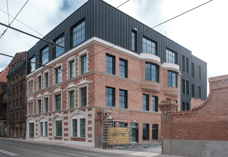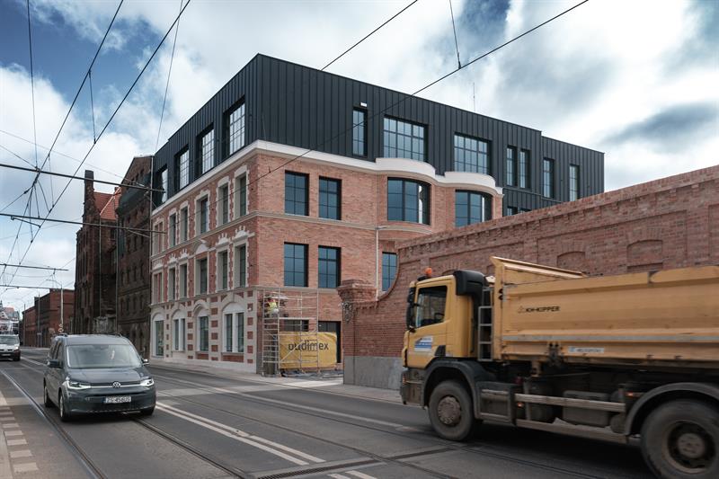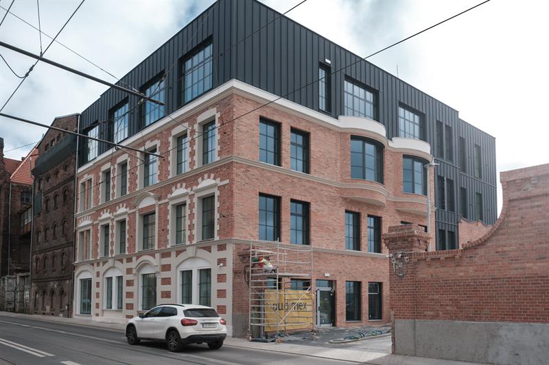 To już ostatni etap prac budowlanych w zrewitalizowanym budynku. Odrestaurowana ceglana elewacja, powstała z odzyskanego materiału rozbiórkowego, jest już w pełni odsłonięta, a inwestycja zrealizowana w około 95 procentach. Do końca maja planowane jest formalne przekazanie obiektu, który będzie nową siedzibą RZGW.