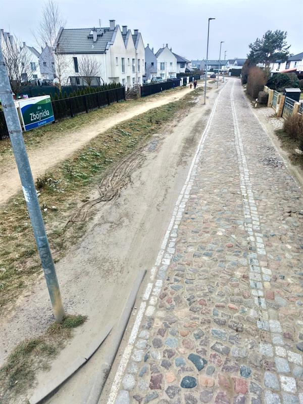 Odcinek ul. Zbójnickiej w Szczecinie - od ul. Europejskiej do granicy miasta - to teraz kocie łby i klepisko. Wkrótce ma zostać wyremontowany. Tyle że w stylu, który budzi niepokój: asfaltowa nakładka umożliwi ekstremalnie szybką jazdę samochodom, kosztem bezpieczeństwa pieszych oraz rowerzystów, tych ostatnich spychając na jezdnię.