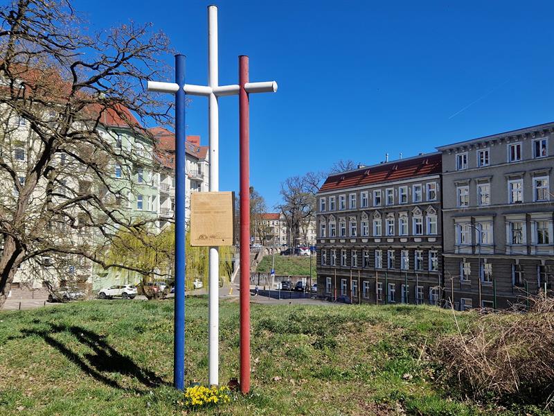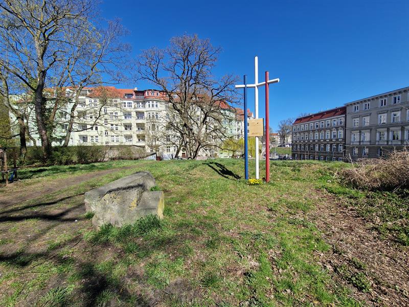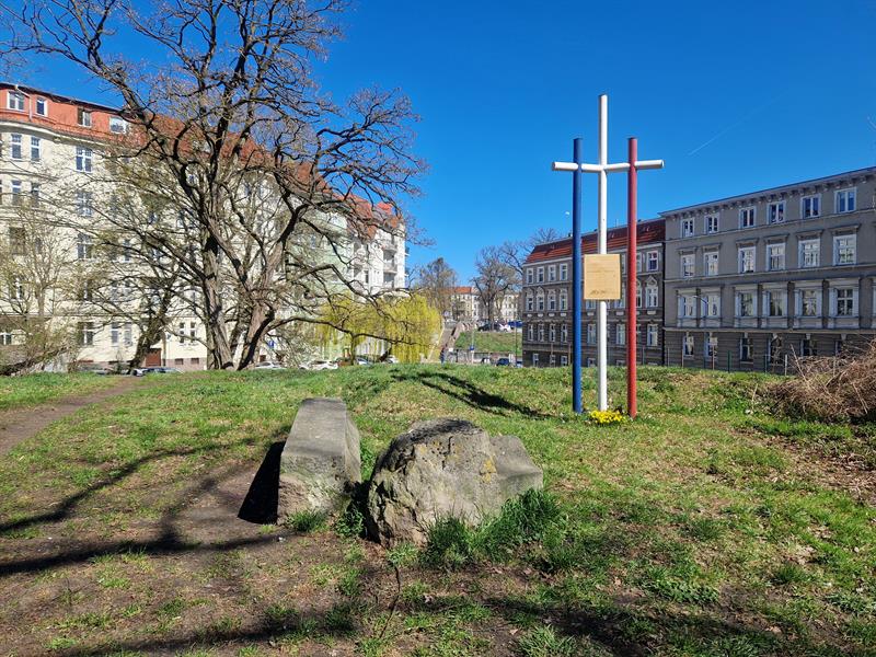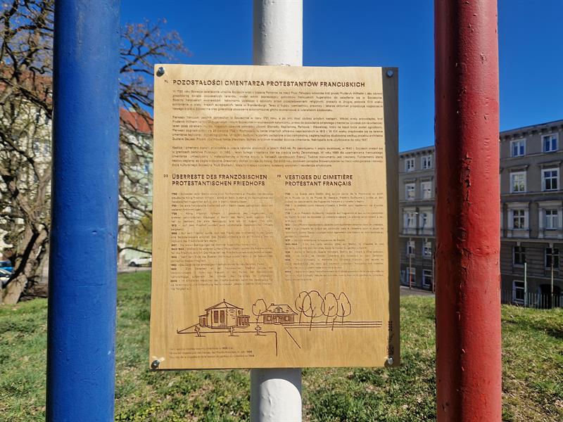 Niewielu Szczecinian wie, że obok tzw. Domku grabarza w Parku im. Stefana Żeromskiego stała kiedyś kaplica francuskich protestantów oraz cmentarz. Dziś po kaplicy pozostały jedynie fundamenty oraz dwa betonowe głazy, po cmentarzu - dom ogrodnika cmentarnego. Przez lata francuską gminę upamiętniał krzyż. Od niedawna wisi na nim również drewniana tabliczka przypominająca historię tego miejsca.