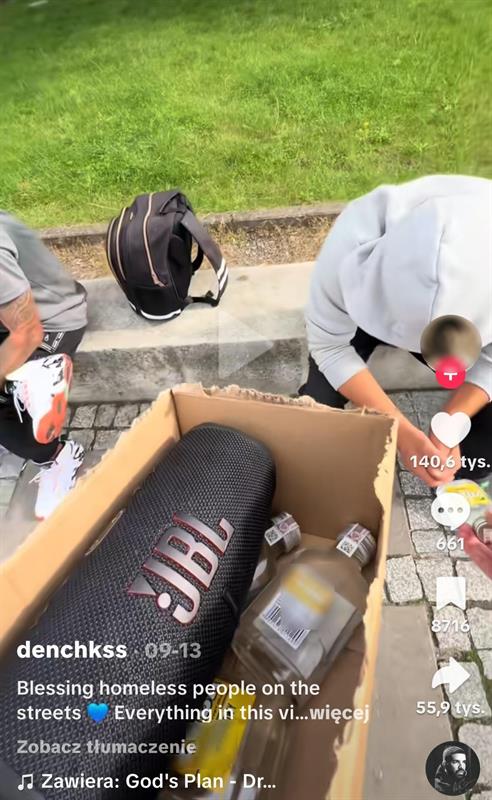 Na kolejnych rolkach Ukraińca widzimy, jak rozdaje alkohol (tzw. „małpki", nieraz piwo) osobom w kryzysie bezdomności, pokazuje ich twarze, nagrywa. Wykorzystuje ich uzależnienie, aby zdobyć wyświetlenia.