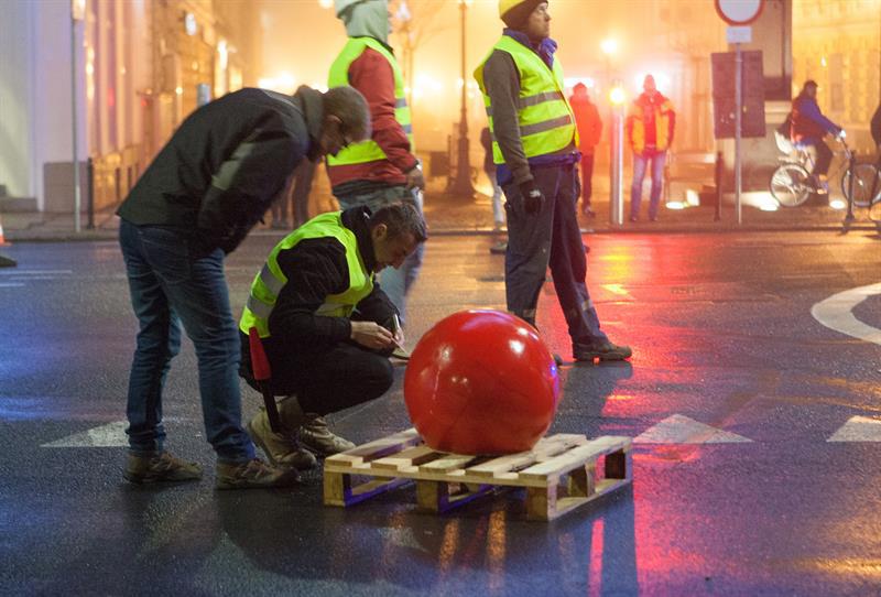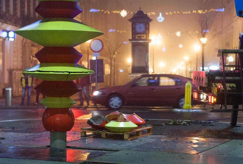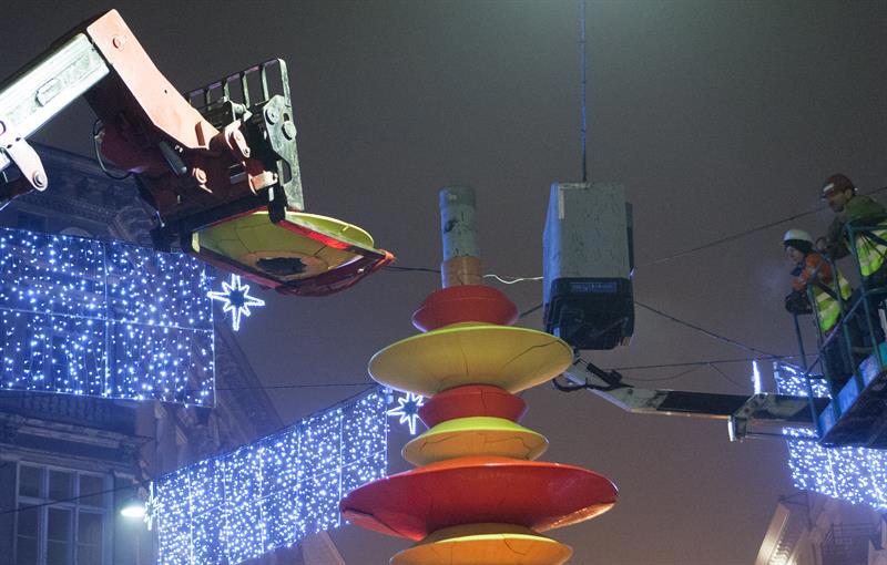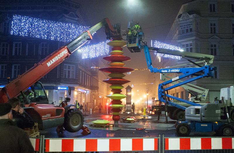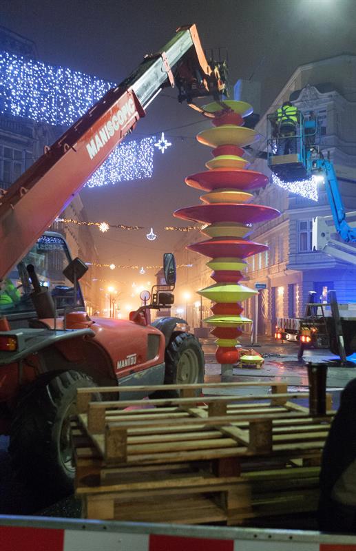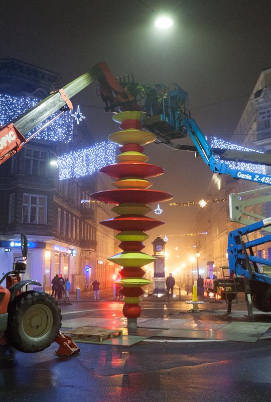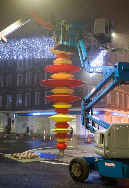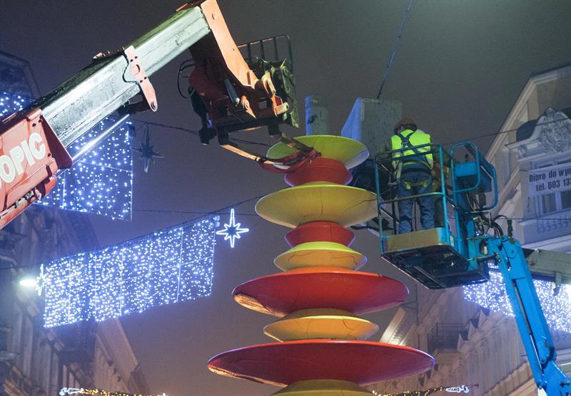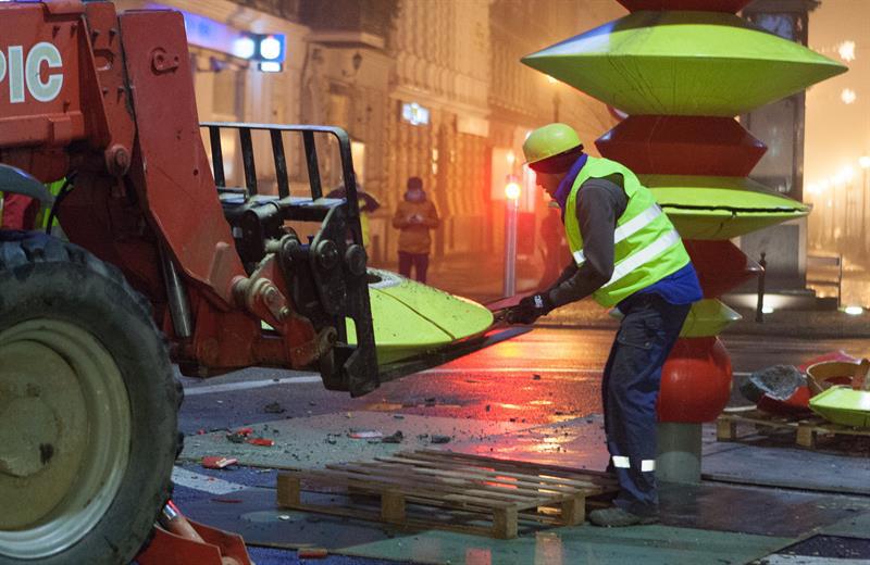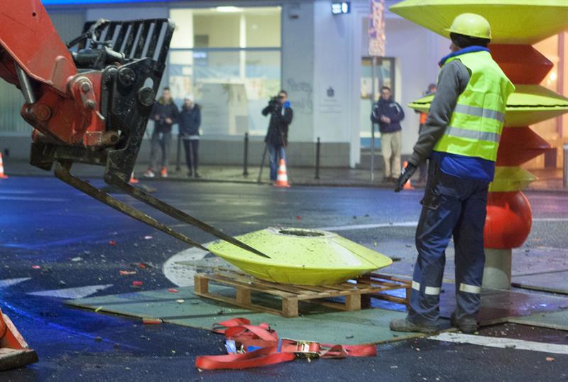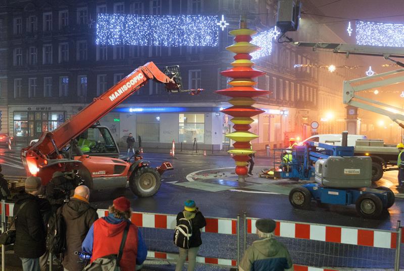 Trwa akcja demontażu Frygi. Prace prowadzone są przy użyciu trzech wysięgników. Poszczególne elementy są rozłączane za pomocą palnika. Cześć z nich trafiła już do kontenera na gruz.