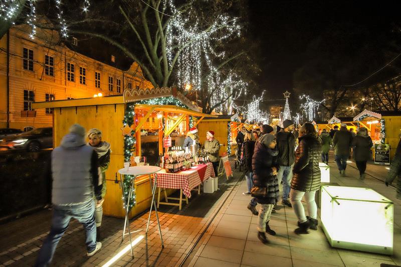 Szczeciński Jarmark Bożonarodzeniowy najpiękniej wygląda po zmierzchu, gdy rozświetlają się kolorowo. Impreza zyskuje wtedy niezwykłą przedświąteczną atmosferę.