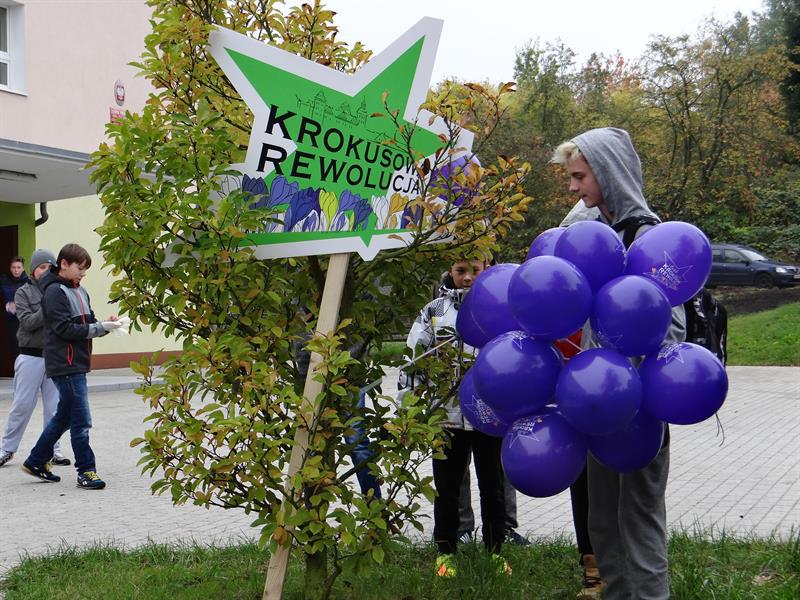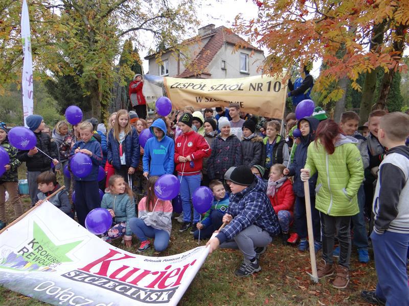 W czwartek, 20 października, Kurierowe sztandary „krokusowej rewolucji” powiewały nad Skolwinem,  przed Zespołem Szkół nr 10 przy ul. Karpackiej. Uczniowie placówki to nasi przyjaciele, chętni do upiększania Szczecina nie od dziś. Wcześniej z ich udziałem posadzonych zostało już tysiąc krokusów. Tym razem uczniów klas 5a, 6a i 6b czekało większe wyzwanie – do posadzenia było 2500 nowych. Ich zakup sfinansowali sponsorzy prywatni pp. Anna i Andrzeja Kawka, rodzice piątoklasisty Witka, jednego z uczniów szkoły.