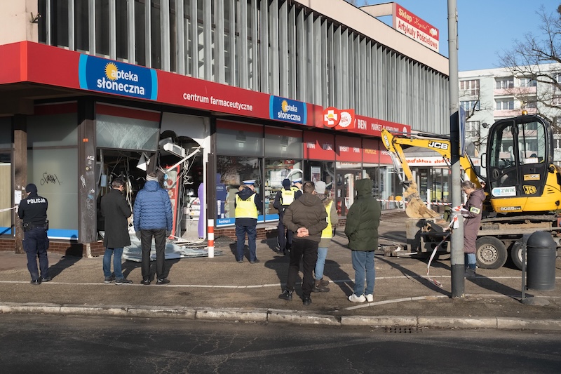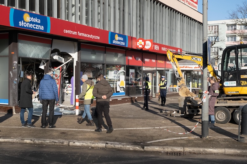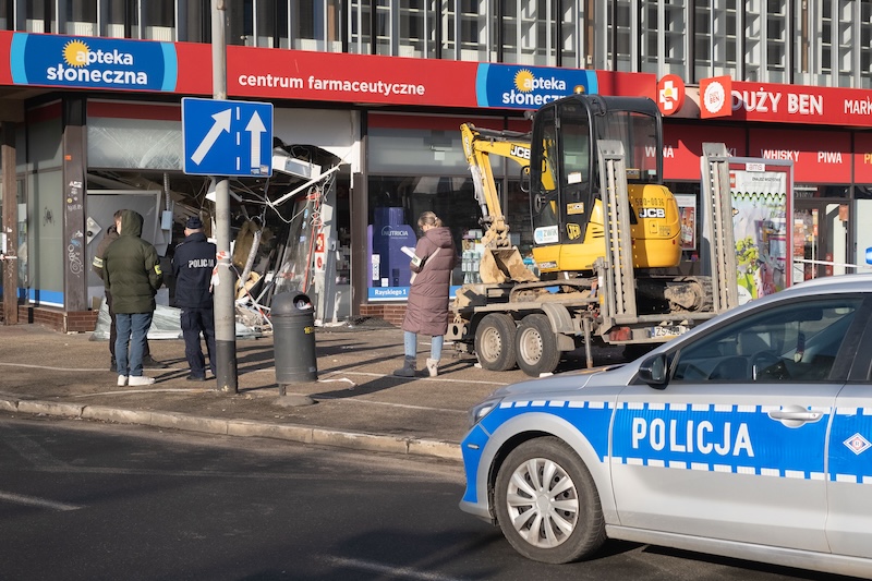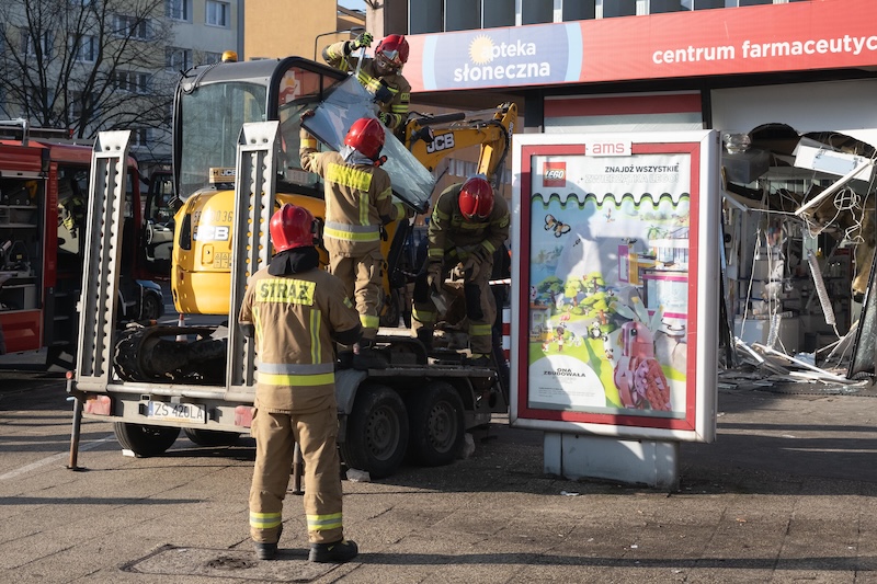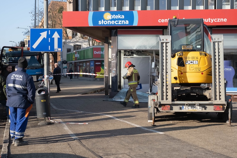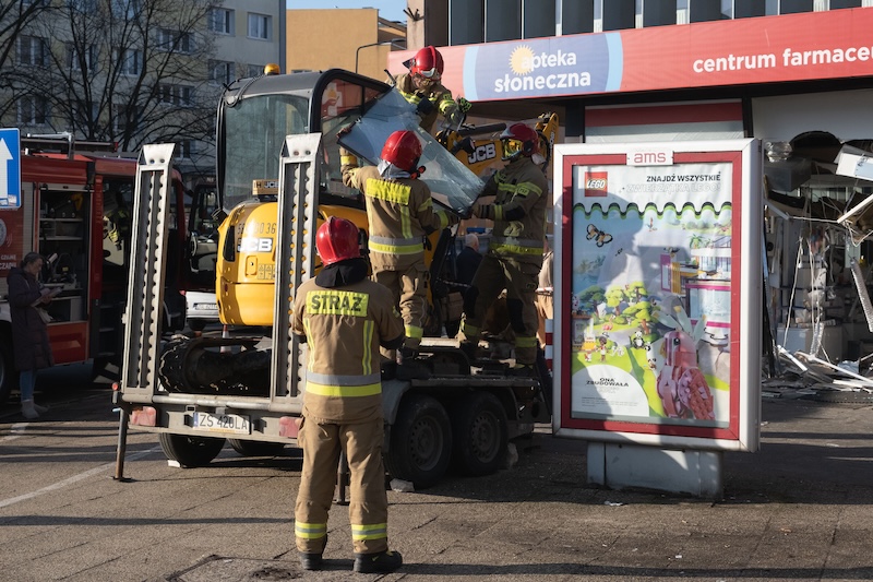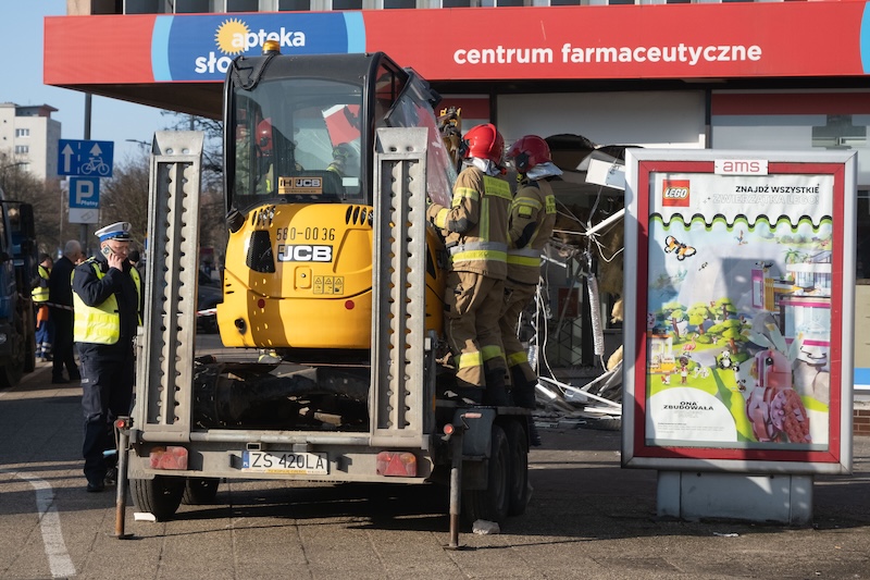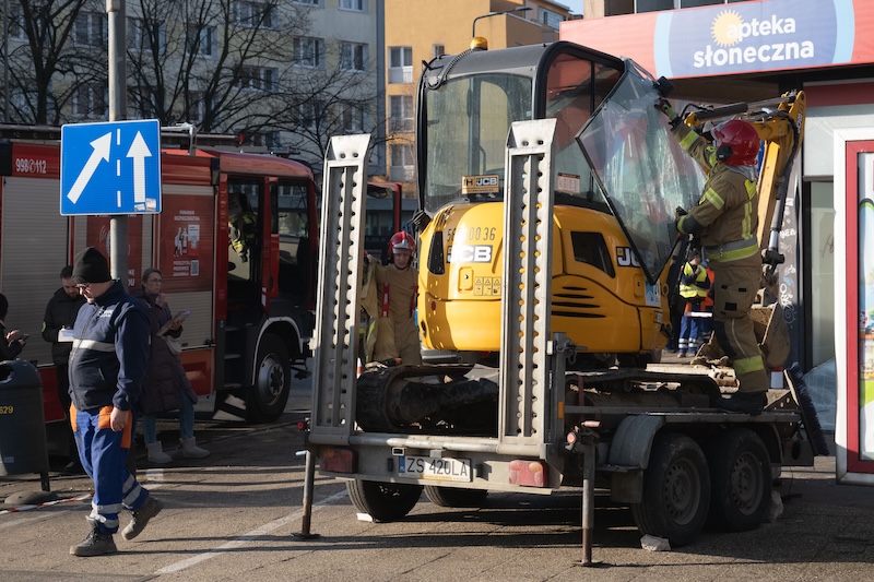 Naczepa z koparką odczepiła się od pojazdu i wjechała w aptekę na ul. Rayskiego w Szczecinie (budynek dawnego Cezasu). Do zdarzenia doszło w czwartek 26 lutego ok. godz. 8.