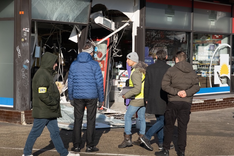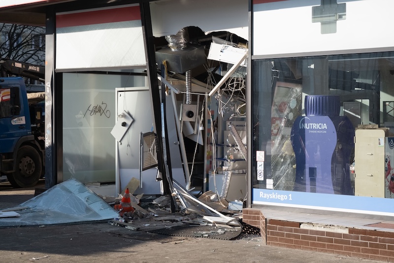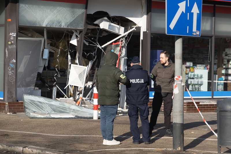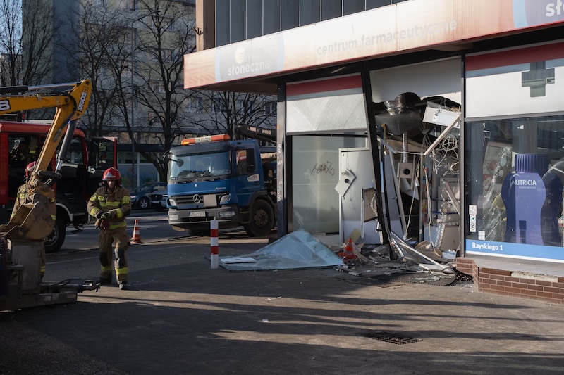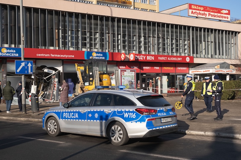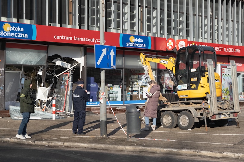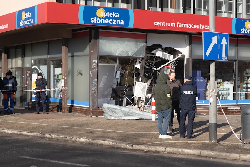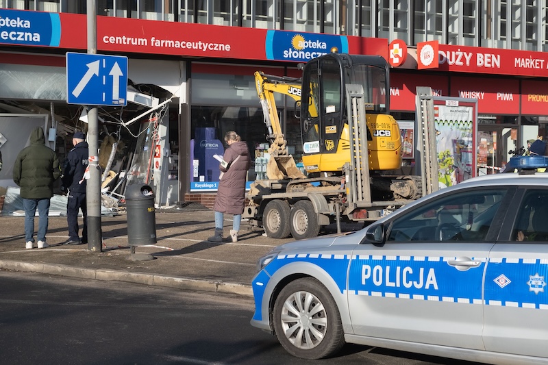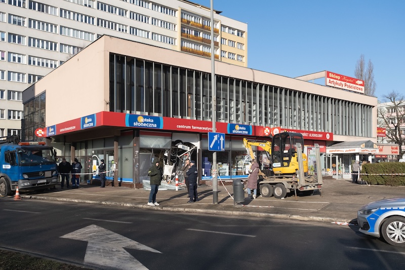 Naczepa z koparką odczepiła się od pojazdu i wjechała w aptekę na ul. Rayskiego w Szczecinie (budynek dawnego Cezasu). Do zdarzenia doszło w czwartek 26 lutego ok. godz. 8.