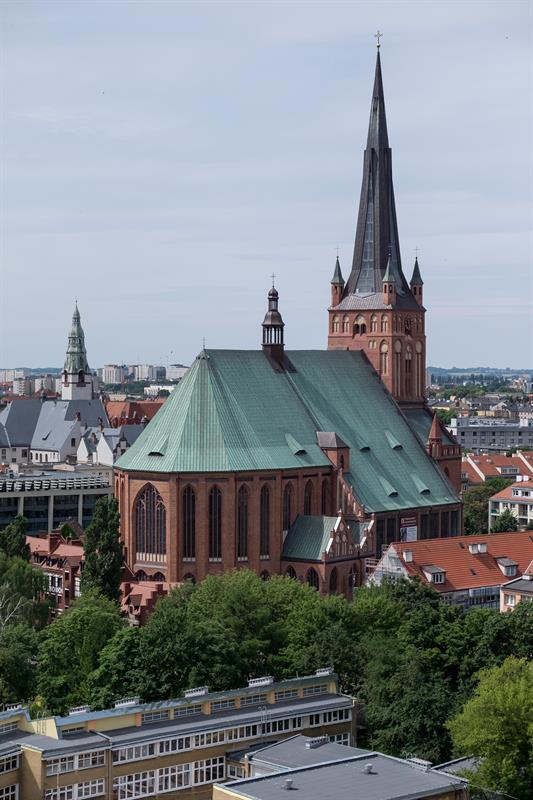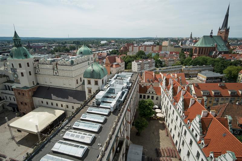 Tak wygląda Szczecin z widokowej wieży dzwonów Zamku Książąt Pomorskich. Od 1 lipca po remoncie można znów z niej podziwiać panoramę miasta.