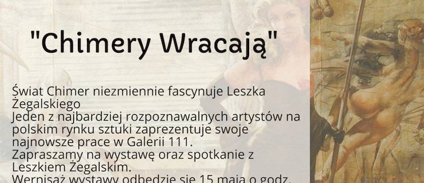 Wystawa malarstwa Leszka Żegalskiego, jednego z najważniejszych twórców polskiej sztuki współczesnej. „Chimery wracają” to prezentacja najnowszych obrazów artysty — intensywnych, symbolicznych, pełnych charakterystycznej dla Żegalskiego ekspresji i nieoczywistych znaczeń.