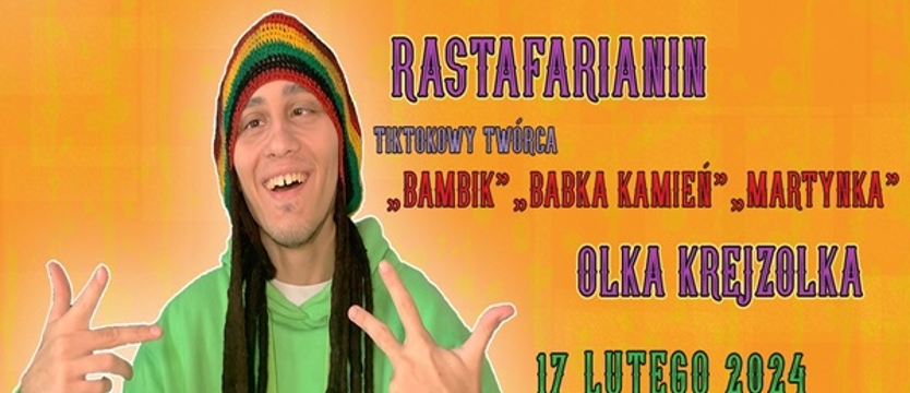 Niesamowita tik tokowa przygoda, około godzinny występ muzyczny, plus zabawy, konkursy, autografy, zdjęcia ze znanymi tiktokerami. Rastafarianin to twórca tiktokowych virali takich jak Bambik, Babka Kamień czy Martynka. Na swoim koncie ma też popularne remixy znanych utworów i swoje oryginalne rapowe kawałki. Razem z nim wystąpi tiktokerka znana pod pseudonimem Olka Krejzolka.