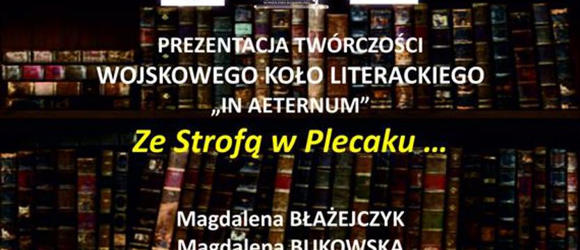 Klub 12. Szczecińskiej Dywizji Zmechanizowanej zaprasza mieszkańców Szczecina na spotkanie z twórczością Wojskowego Koła Literackiego „In Aeternum” pt. „Strofy w plecaku”. Uczestnikami tego spotkania będzie młoda generacja literatów: Magda Błażejczyk, Magdalena Bukowska, M.P. Hardy, Mateusz Prygoń.