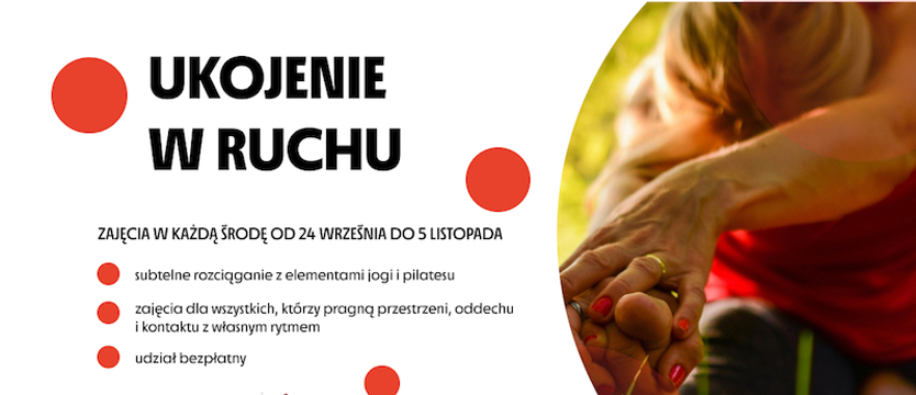 Zapraszamy osoby w każdym wieku 16+, poszukujące ukojenia, ruchu i możliwości integracji z sąsiadami. Prowadząca Alicja Sieracka. Do zabrania ze sobą: wygodny strój - dobrze mieć ze sobą skarpetki antypoślizgowe; mata.