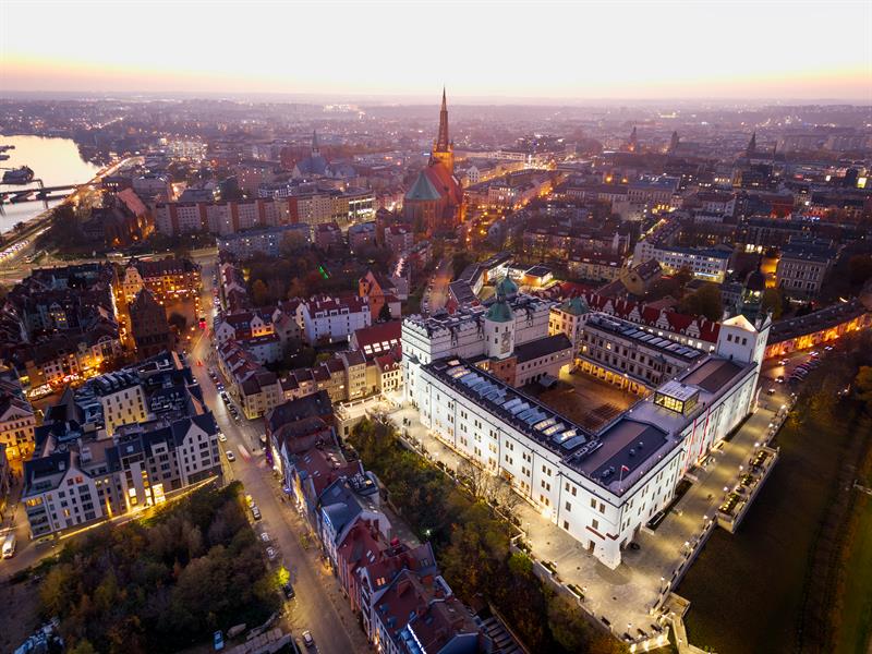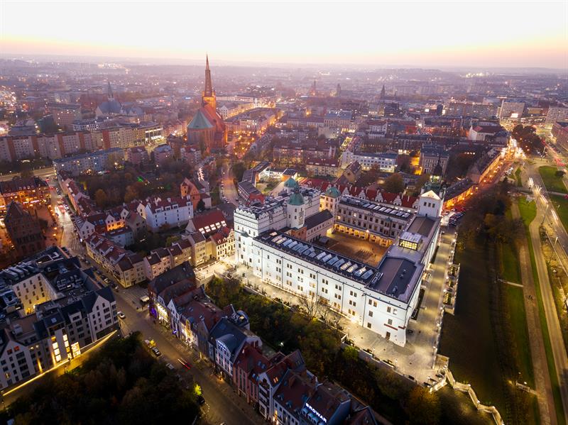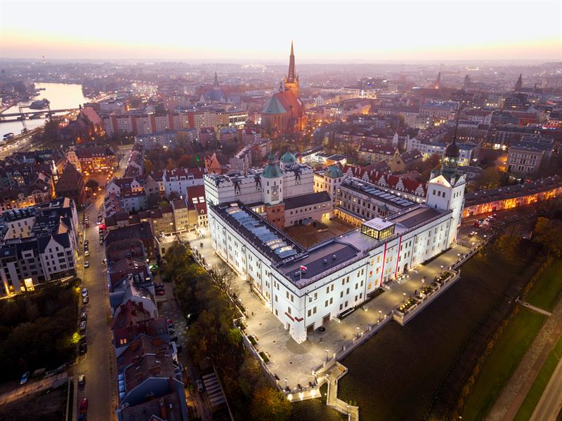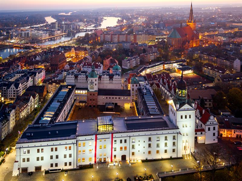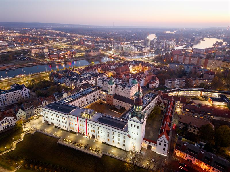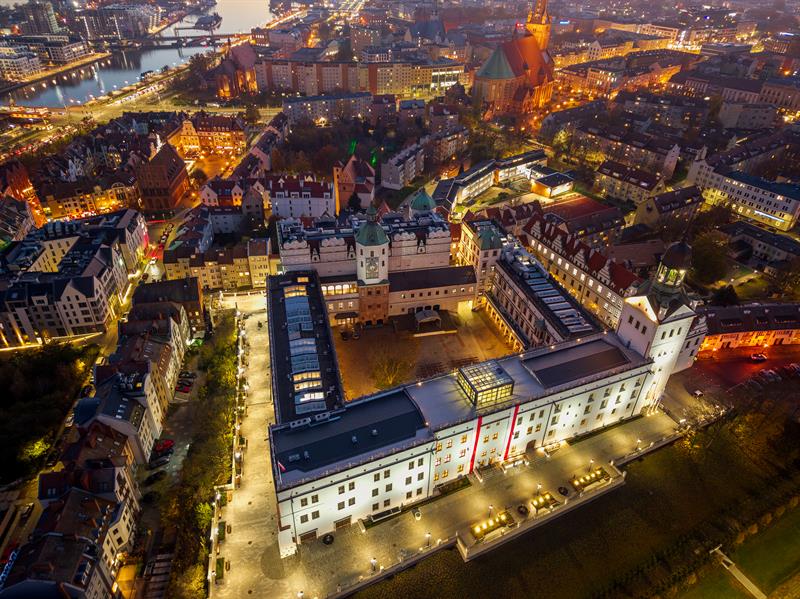 Szczecin po zmroku potrafi zaskoczyć. Gdy zapalają się światła miasta, Zamek Książąt Pomorskich wygląda zupełnie inaczej niż za dnia – spokojniej, bardziej nastrojowo. Nowe oświetlenie wydobywa jego kształt z ciemności, a wieczorne refleksy sprawiają, że zamek naprawdę przyciąga wzrok.