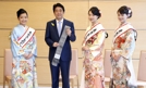 Japoński premier Shinzo Abe spotkał się w swojej rezydencji ze zwyciężczyniami konkursu na królową kimona, wśród których znalazły się Kaori Taga, Yuri Murakami i Kanna Iwasa. Kobiety z wdziękiem prezentowały ten tradycyjny strój. Fot. EPA/Eugene Hoshiko
