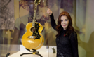 Priscilla Presley, była żona Elvisa, pozuje z gitarą Gibson J-200 na wystawie w Londynie. Ekspozycja została wzbogacona o kilka nowych elementów, w tym właśnie o tę gitarę i garnitur króla rock and rolla z jego ostatniego występu w 1977 roku. Fot. EPA/WILL...