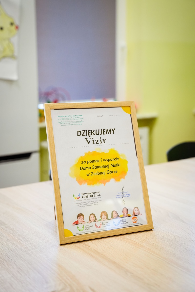 Z okazji ukończenia remontu przy wejściu do placówki na drzewie obrazującym wsparcie różnych podmiotów Stowarzyszeniu zawisł pomarańczowy liść z napisem „Vizir 2025” - symboliczne podziękowanie marce za przekazaną pomoc. Dzięki pomocy marki podopieczne Stowarzyszenia mogą cieszyć się odnowionymi wnętrzami: czystymi, jasnymi, wolnymi od wilgoci. Odnowione zostały sypialnie i jadalnia, pokój zabaw, powstało także nowe pomieszczenie - „pokój nauki”, gdzie oprócz komfortowego wnętrza dzieci moga korzystać z pomocy edukacyjnych. Dużym wyzwaniem była pralnia, która ze względu na intensywną eksploatację wymagała gruntownego remontu.